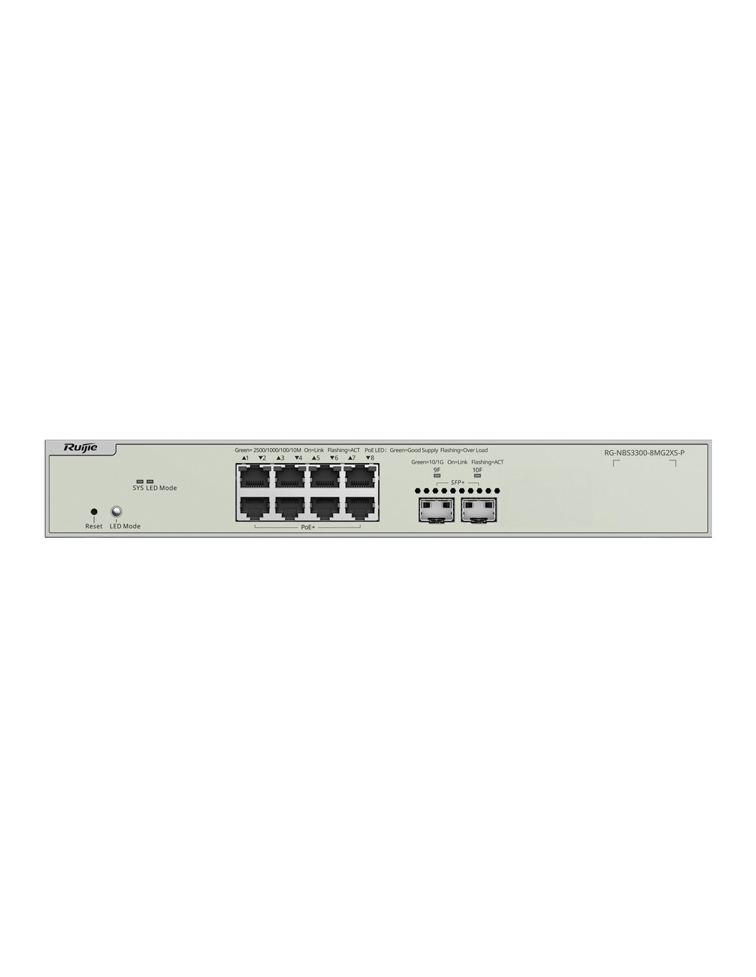 Reyee Switch PoE Cloud Capa 2 - 8 puertos PoE MultiGigabit+ 2 10Gbps SFP+ - PoE 802.3af/at Máximo 240W - Static LAG/DHCP Snoop/IGMP Snoop/Port Mirror - VLAN/Port Isolation/STP/RSTP/ACL/QoS - Enrackable