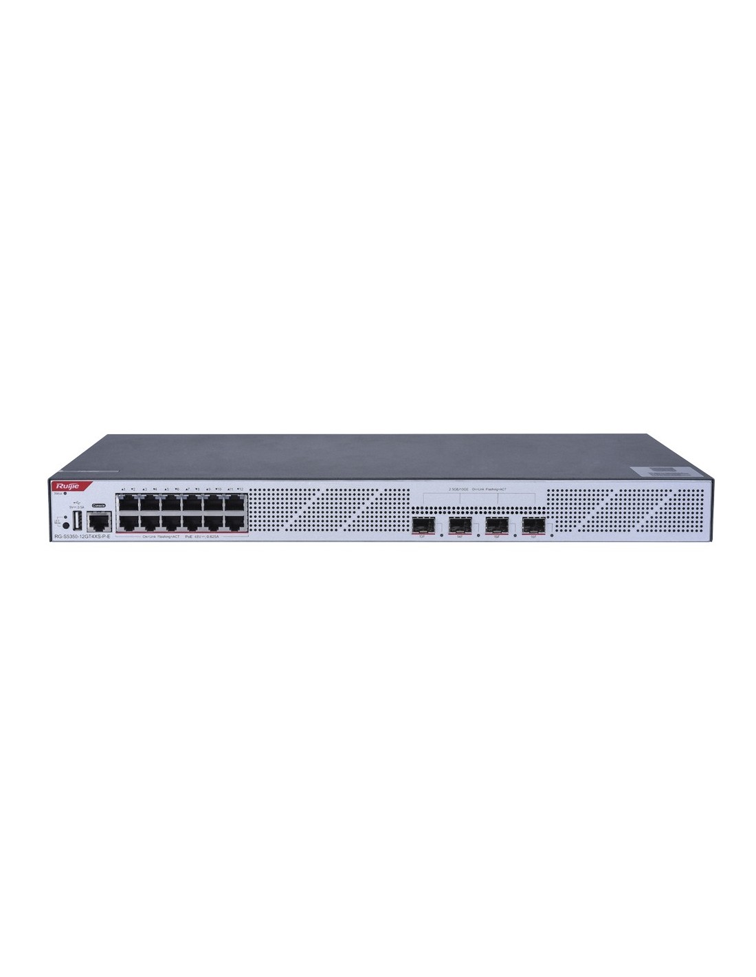 | Interface | 12 Puertos PoE RJ45 + 4 Puertos SFP+ + 1 Puerto Consola + 1 Puerto USB |