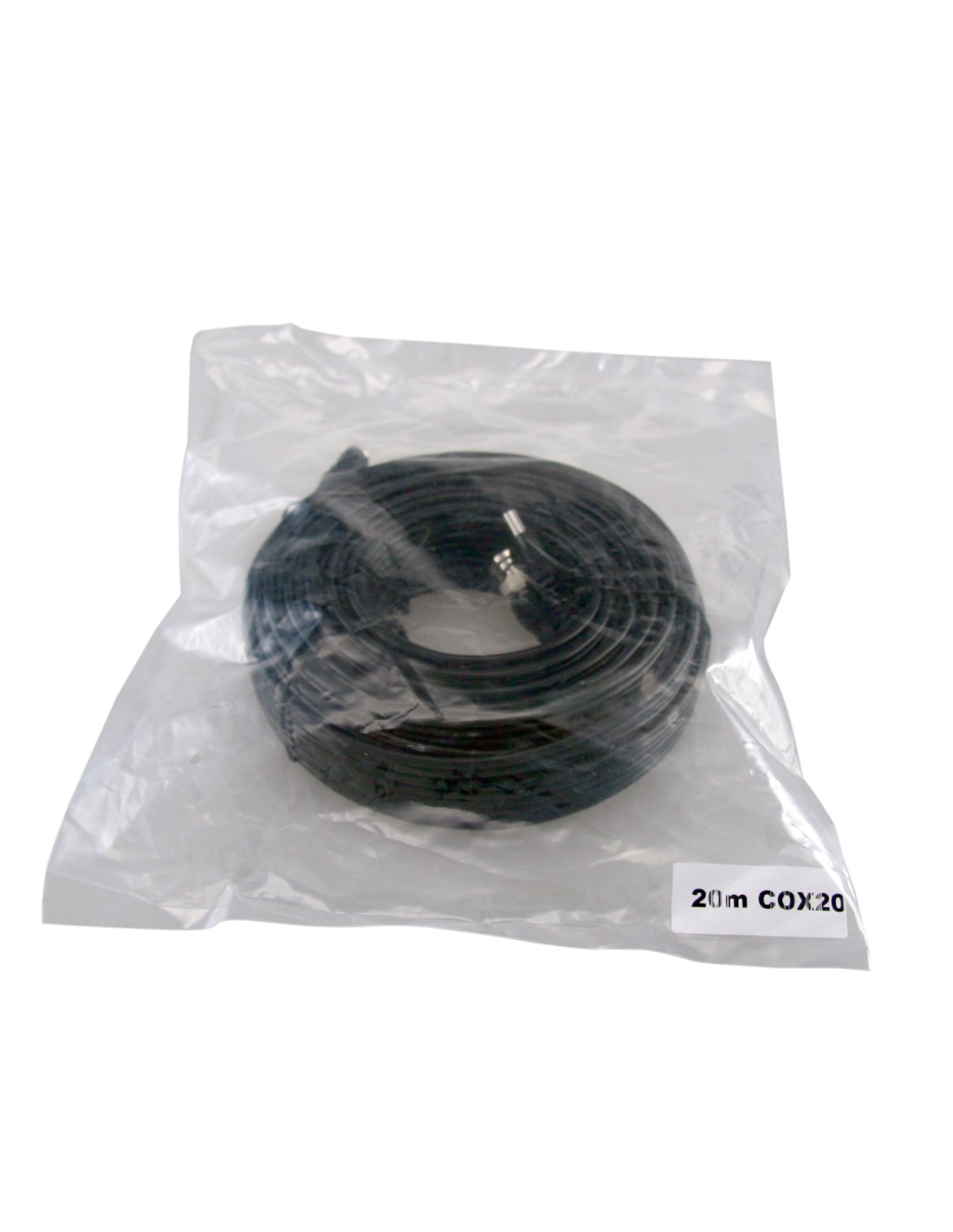 Cable coaxial SAFIRE alargador para señales de vídeo y alimentación. Cable combinado RG59 + DC. Bajas pérdidas. Longitud fija de 20 metros, con conector macho BNC de vídeo en los extremos.