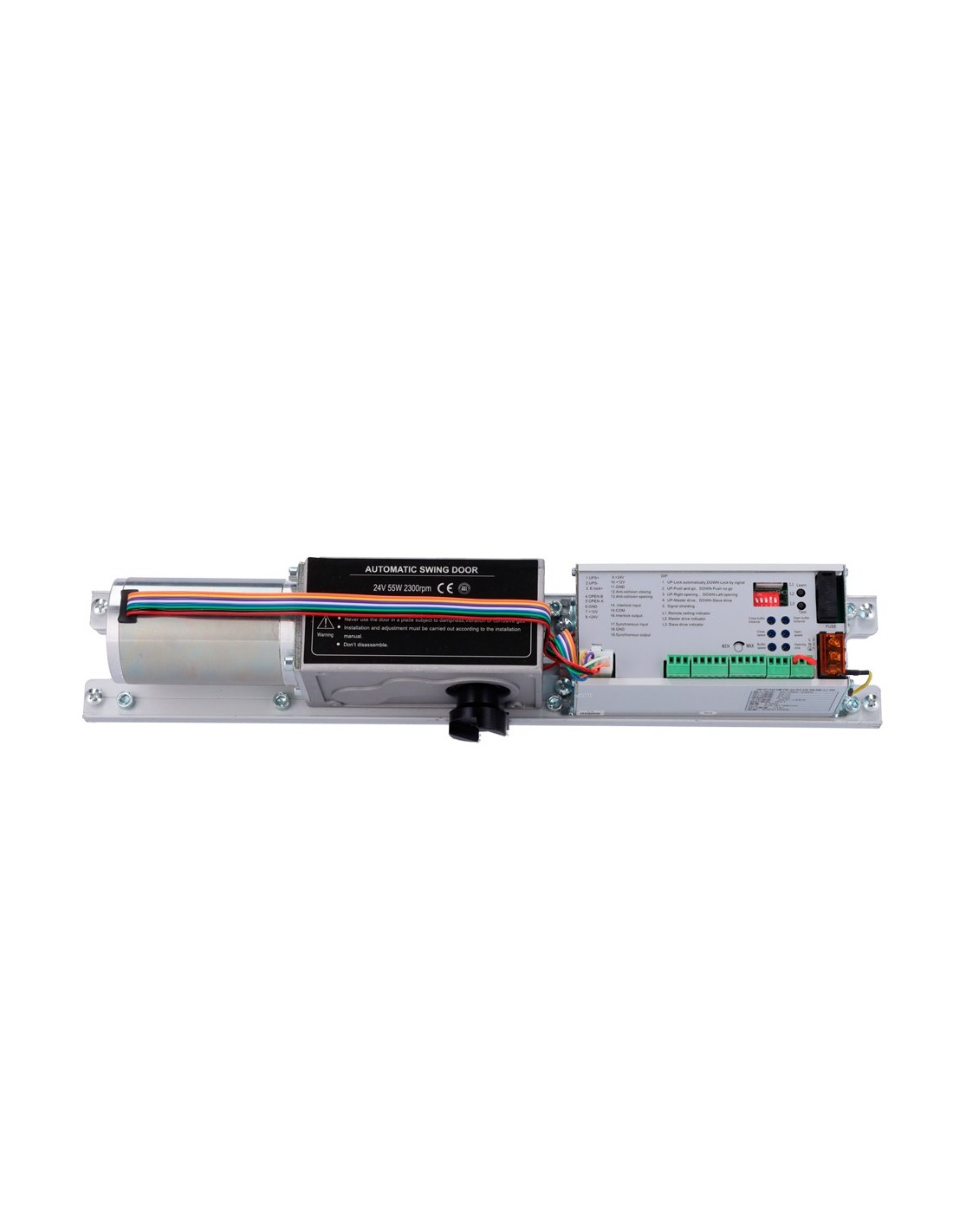 Operador de puerta automático - Brazo recto - Apertura hacia el interior - Puertas hasta 150 kg y 1200 m - Velocidad, fuerza y tiempos configurables - Apto para todo tipo de puertas