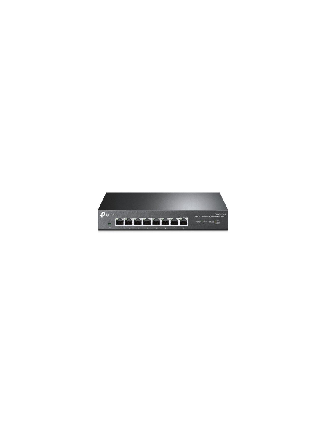 TP-Link TL-SG108-M2. Cantidad de puertos básicos de conmutación RJ-45 Ethernet: 8. Tabla de direcciones MAC: 16000 entradas, Capacidad de conmutación: 40 Gbit/s. Estándares de red: IEEE 802.3,IEEE 802.3ab,IEEE 802.3bz,IEEE 802.3p,IEEE 802.3u,IEEE 802.3x. Voltaje de entrada DC: 12 V