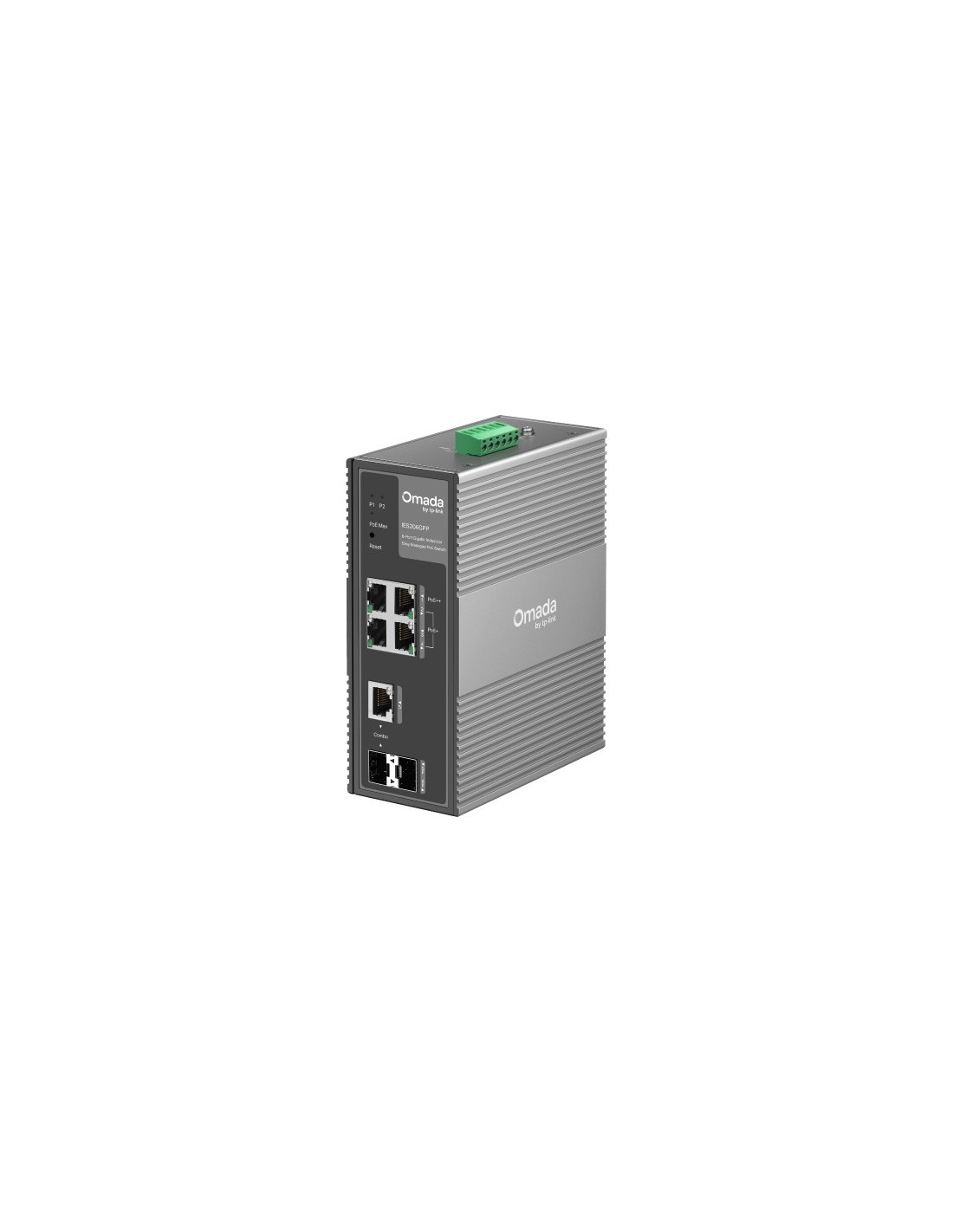 Switch Industrial Omada Gestionable 6 Puertos Gigabit, 3 Puertos PoE+ y 1 Puerto PoE++ | 4× Puertos Gigabit RJ45 (1× PoE++, 3× PoE+). 1× RJ45/SFP Gigabit Combo, 1× Gigabit SFP | 120W Potencia PoE Total* con Puerto PoE++ de hasta 60W | Diseño Industrial: -40~75°C, 6kV y Alimentación Redundante 1+1 | Hasta 250m PoE. Capacidad Switching 12 Gbps. Gestión Cloud Centralizada | Carcasa Aluminio y Montaje en Carril DIN / Pared