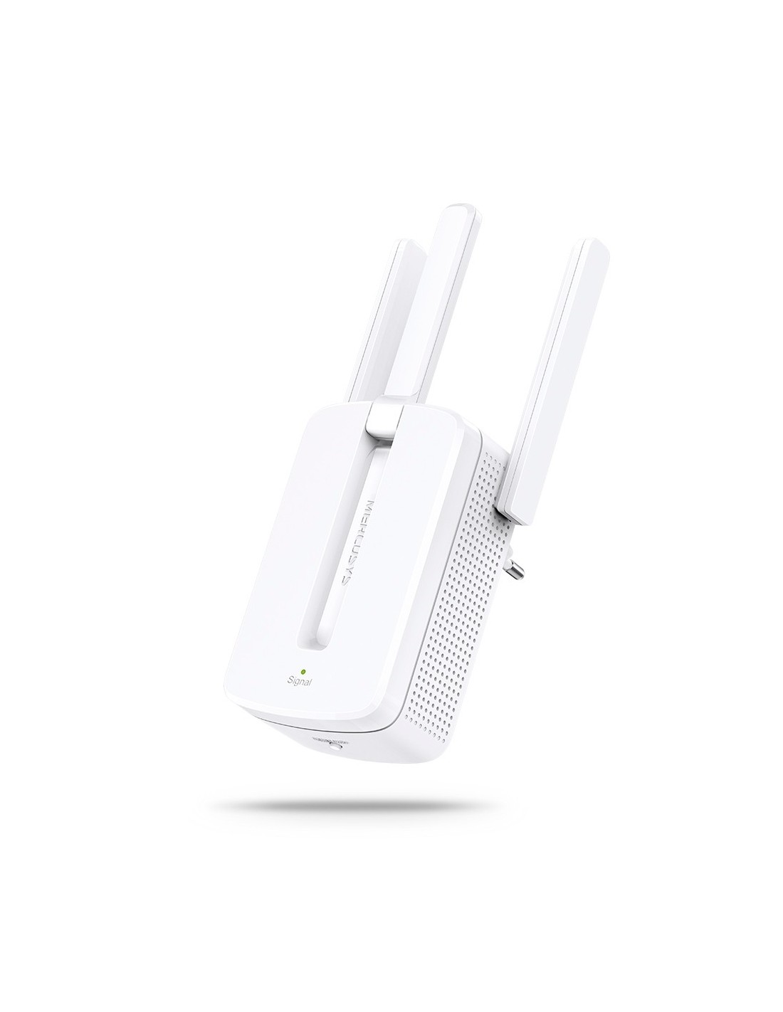 Extensor Wi-Fi Mercusys N300. Banda única 2,4 GHz con velocidad de hasta 300 Mbps. 3 antenas externas. Botón WPS. Indicador LED multicolor de señal. Instalación en pared. Seguridad WPA2. Plug & Play. Diseño compacto