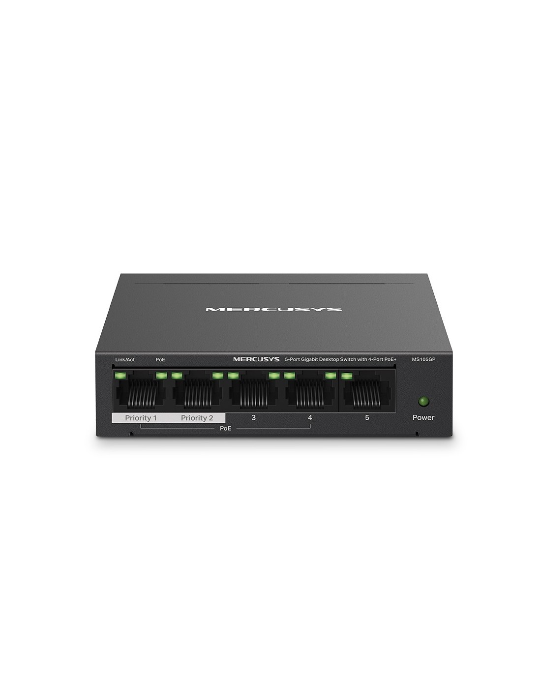 Switch PoE Mercusys MS105GP. 5 puertos 10/100/1000 Mbps, 4 de ellos con PoE+. Entrega PoE de 65?W (hasta 30?W por puerto). Modos Extend e Isolation para mayor alcance y seguridad. MAC table de 2K. Carcasa metálica compacta. Sin ventilador. Plug & Play