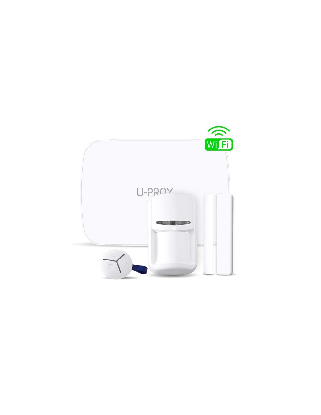 Kit U-Prox MP WiFi S blanco compuesto por:. 1x Central WiFi + GPRS de seguridad UPROX-007 (U-Prox MP WIFI CENTER WHITE) de 30 particiones y hasta 99 detectores vía radio. 1x Detector PIR vía radio UPROX-017 (U-Prox PIR WHITE) con antimascotas. 1x Contacto magnético vía radio UPROX-026 (U-Prox WDC WHITE). 1x Pulsador vía radio de 3 botones UPROX-032 (U-Prox KEYFOB WHITE)