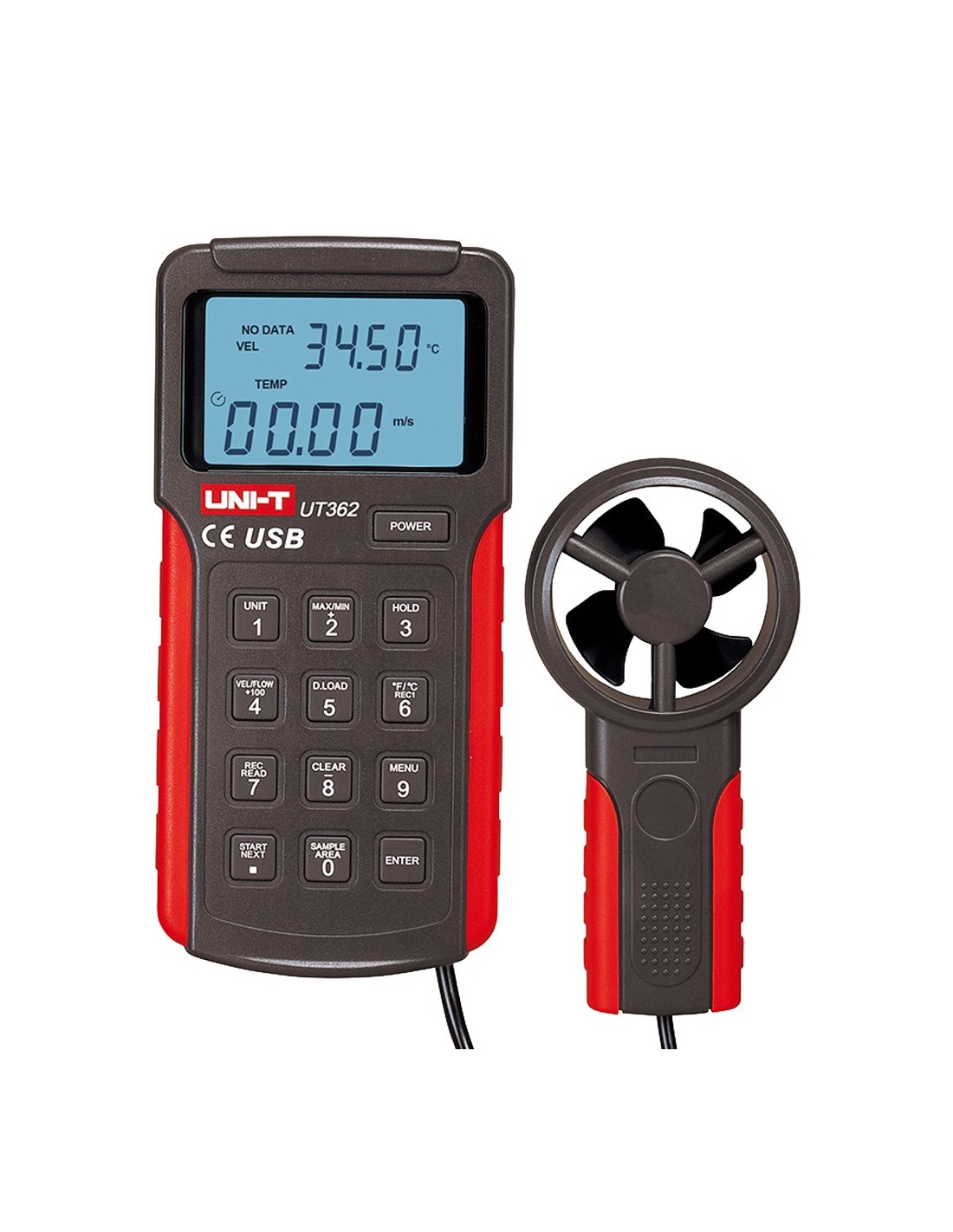 Anemómetro tipo Split - Sensor de velocidad del viento de alta precisión - Sensor de temperatura - Apagado automático | Memoria - Conexión a PC mediante USB - Display LCD retroiluminado