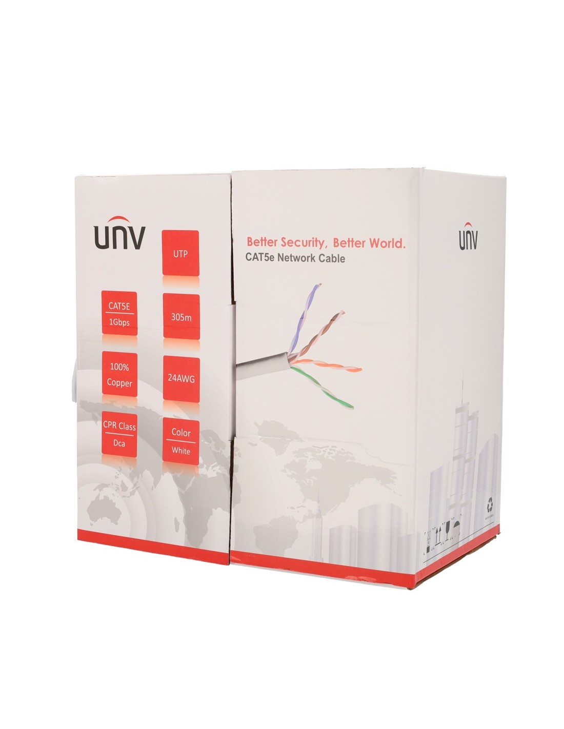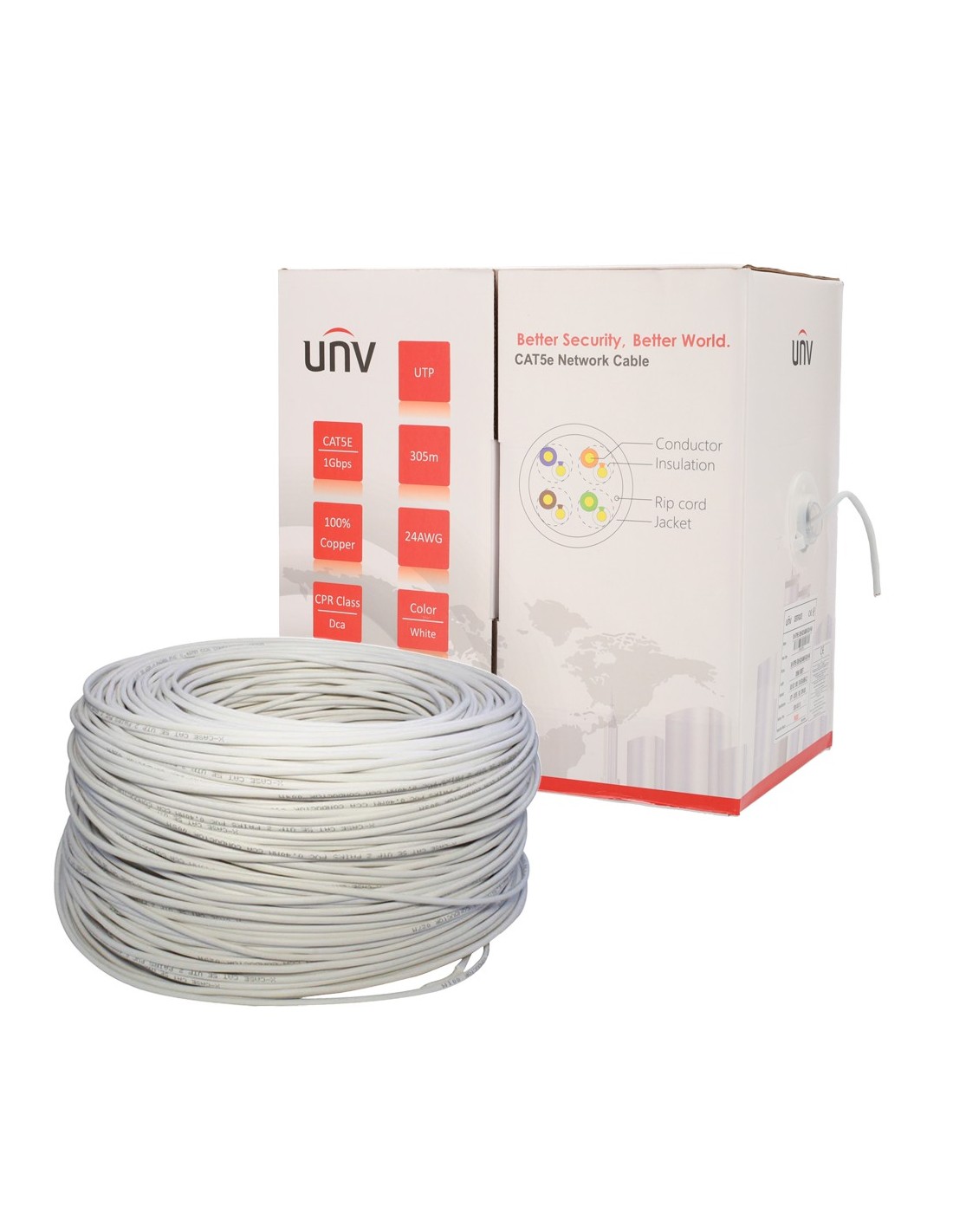 Uniview cable UTP categoría 5E, - Conductor OFC,100% cobre - Diámetro 24 AWG-0,49mm - Certificado Dca-s2,d2,a1 - Cubierta exterior LSZH / Color blanco-gris - Se suministra en caja de cartón de 305 metros