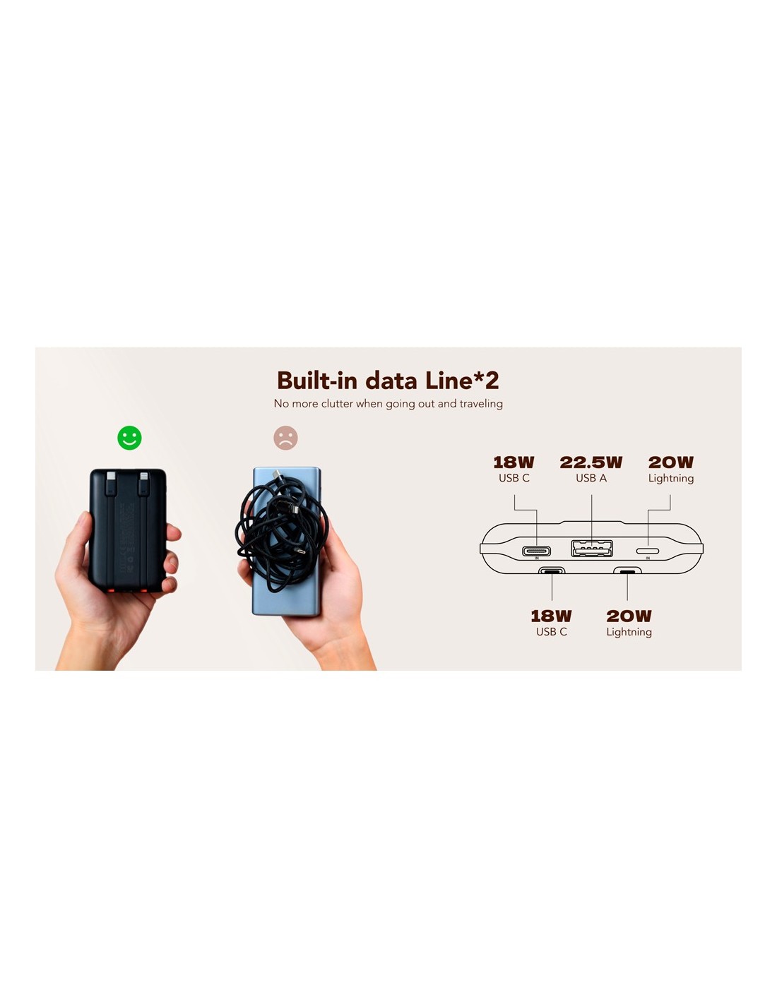 | Conectores | Entradas: 1x Cable USB-C 5V-2.6A / 9V-2A / 12V-1.5A (18W) 1x Puerto USB-C 5V-2A/9V-2A/12V-1.5A (18W) 1x Puerto Lightning 5V-2A (10W) Salida: 1x USB-A 4.5V-5A/ 5V 4.5A / 9V-2A / 12V-1.5A (22.5W) 1x Cable USB-C 5V-3A /9V-2.22A / 12V-1.67A (18W) 1x Cable Lightning 5V-2.4A / 9V-2.22A, (20W) |