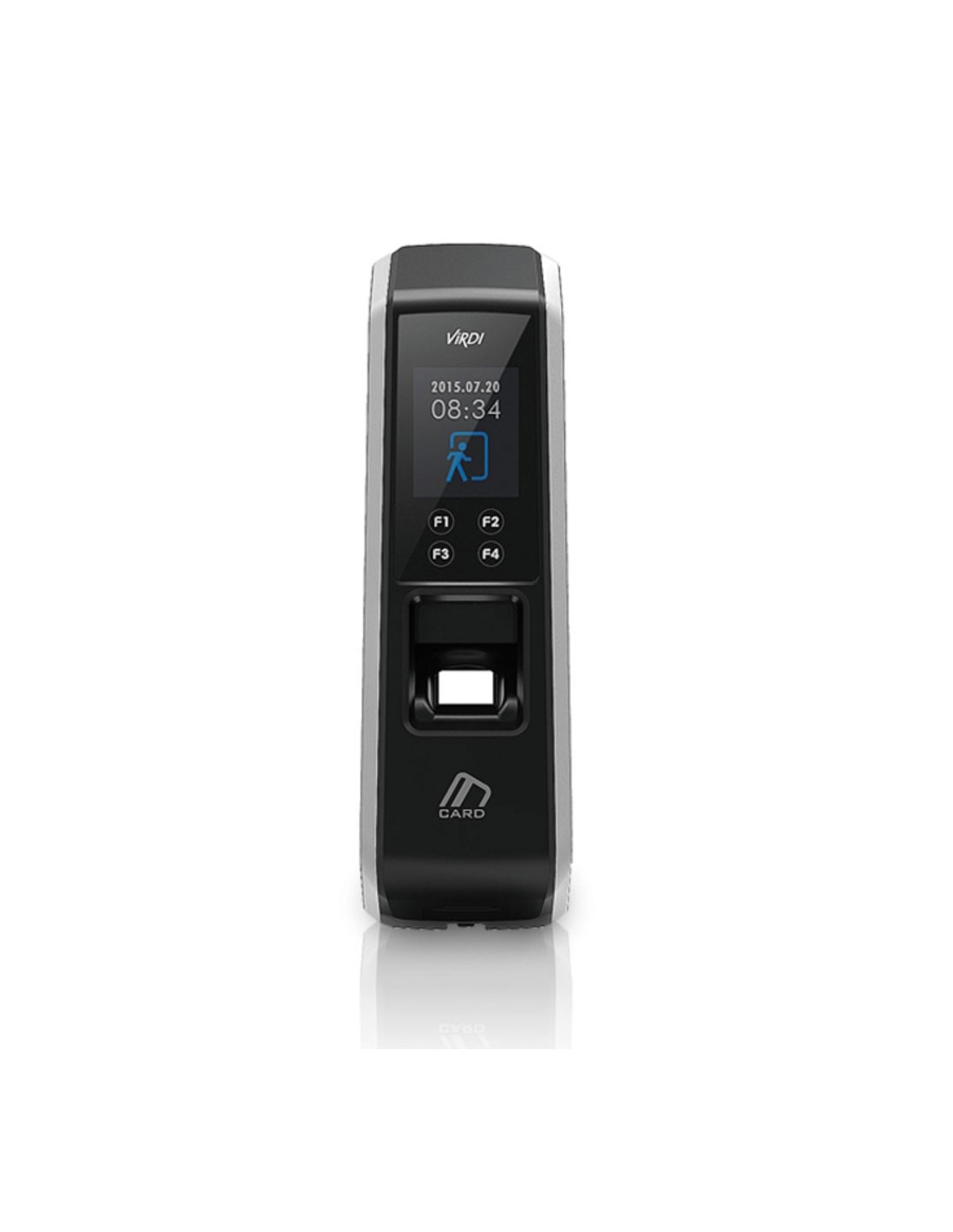 Lector biométrico ViRDI para Control de Acceso y Presencia con lector de tarjetas EM 125KHz y pantalla táctil de 1,77" incorporados. Detección de huella falsa. 10.000 usuarios (1:1). 1.500 patrones de huella (1:N). 100.000 eventos. Autentificación de