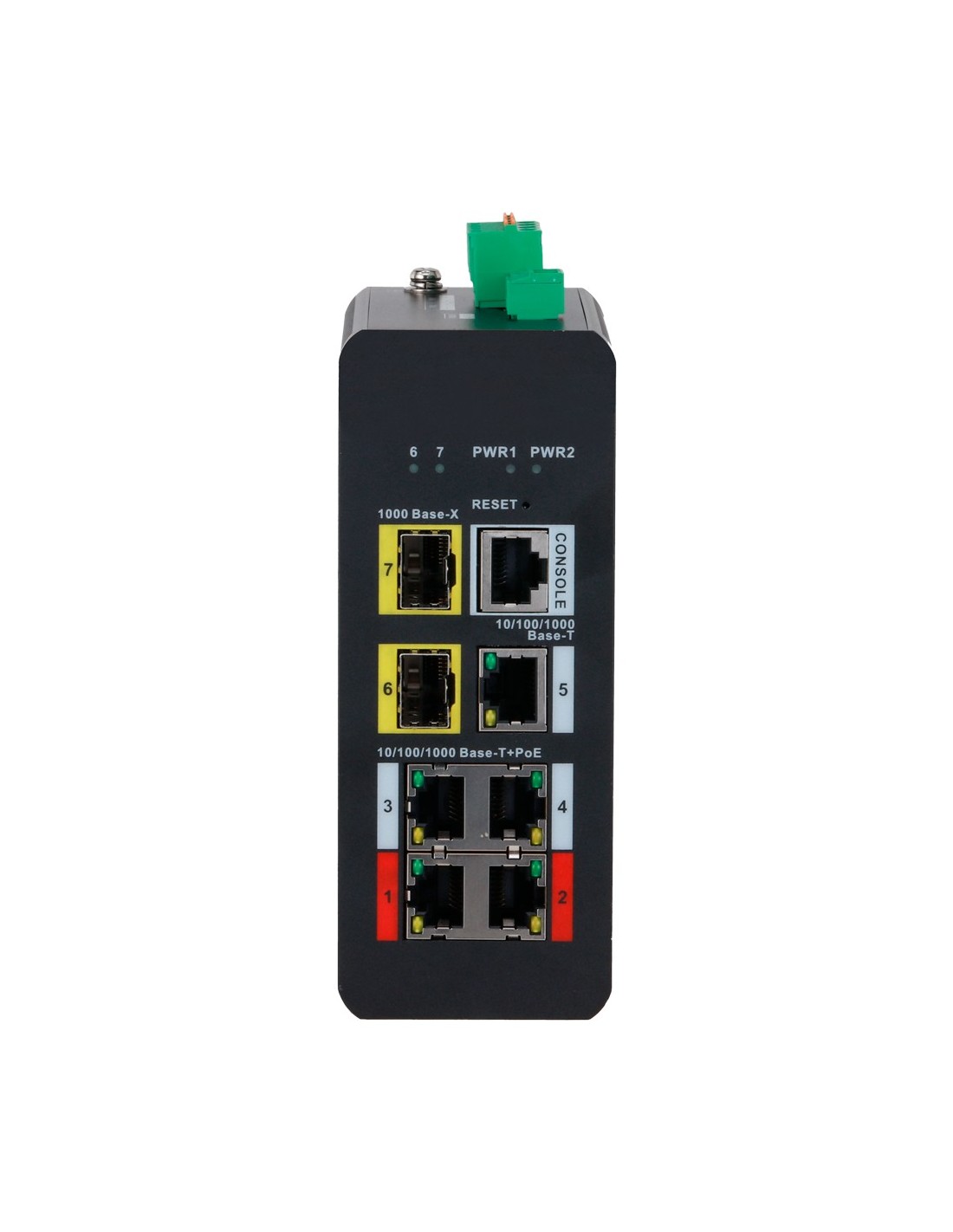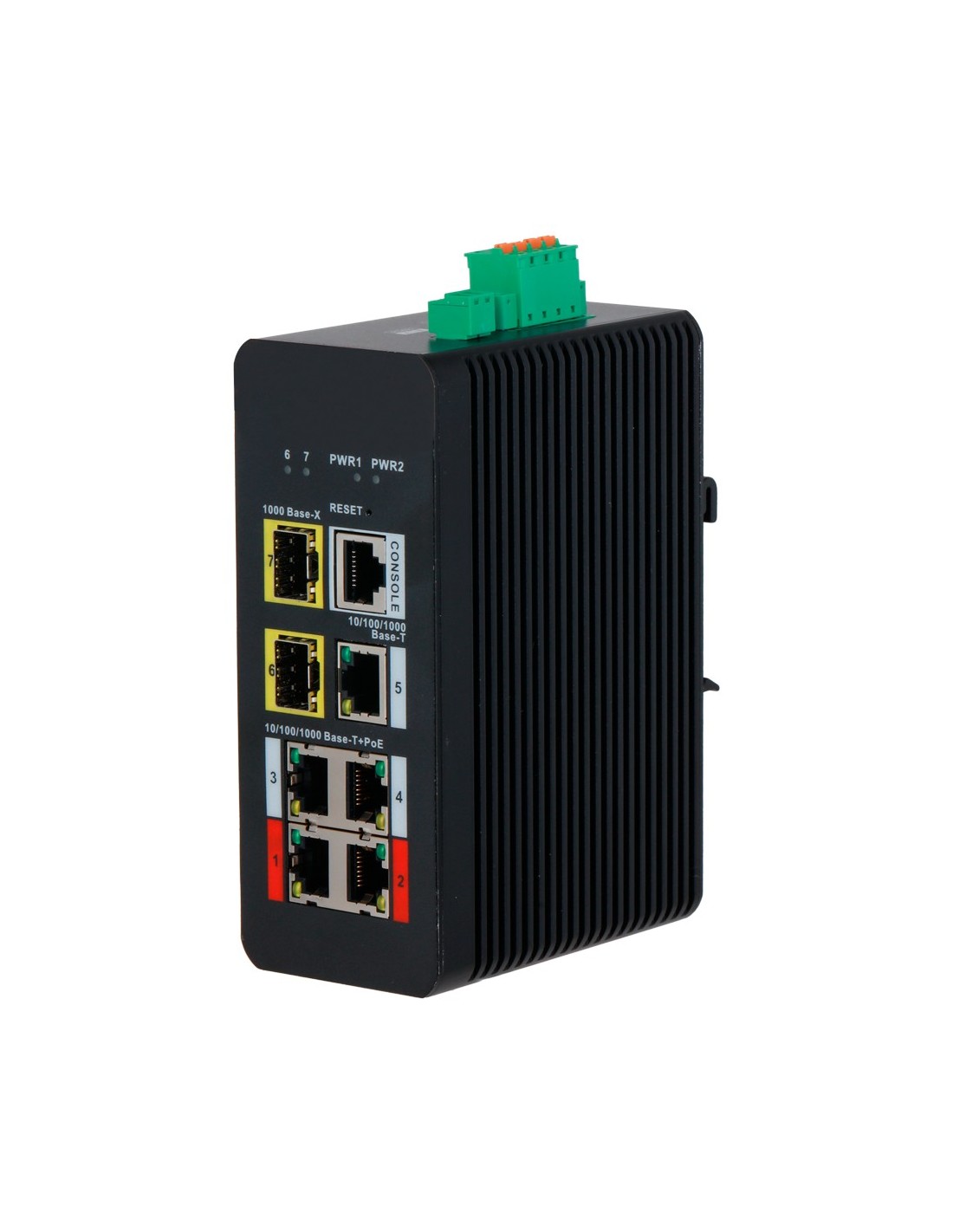- 4 puertos PoE RJ45 Gigabit + 1 puerto RJ45 Uplink Gigabit + 2 puertos SFP Gigabit