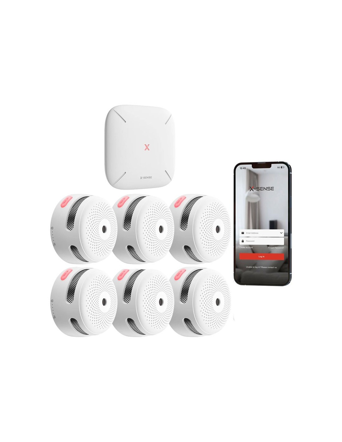 Kit de detección de incendio autónomo X-Sense compuesto por:. 1x Hub de comunicación X-Sense FOC-957 (SB550). 6x detectores inteligentes de humo FOC-948 (XS01-M)