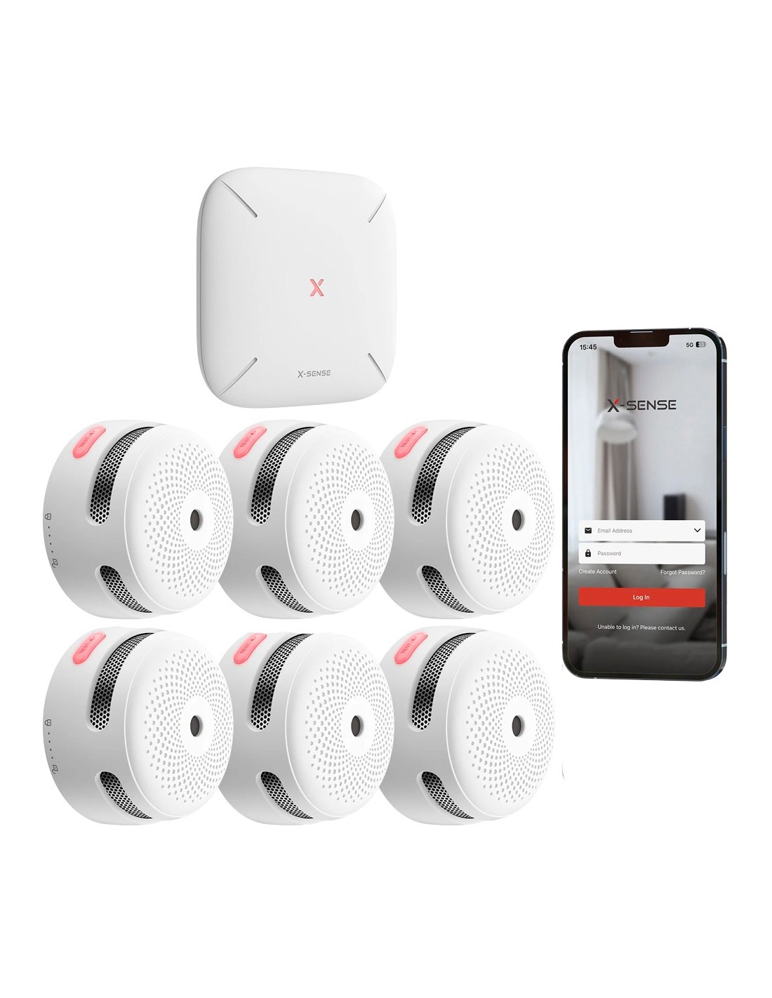 Kit de detección de incendio autónomo X-Sense - Inlcuye 6 detectores de humo XS01-M y Hub SBS50 - Conexión con HUB SBS50 para comunicación por APP - Permite conectar 50 detectores en la misma red - Alarma sonora 85 dB a 3m - Certificado EN 14604