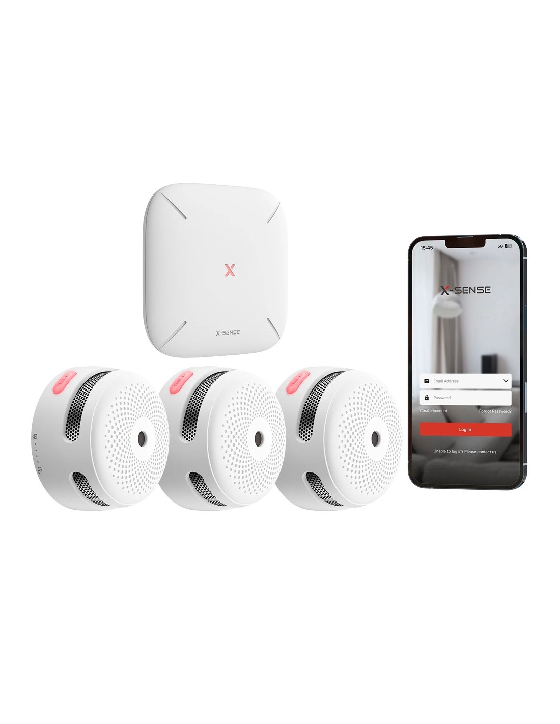 Kit de detección de incendio autónomo X-Sense | Incluye | 3 detectores de humo | autónomos fotoeléctricos XS01-M y | Hub de conexión | SBS50 | Comunicación por | APP. | Hasta 50 detectores | conectados al hub | Alarma sonora 85dB. | Certificado EN 14604 | . Comunicación | WiFi | 2.4GHz | Comunicación inalámbrica entre dispositivos 868MHz | Permite conectar varios dispositivos para que suenen a la vez