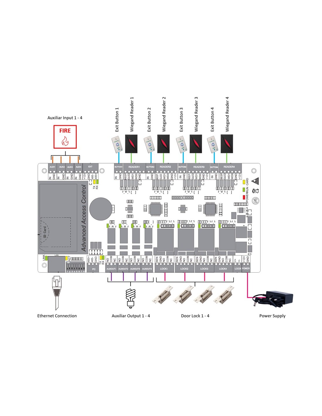 Esta controladora soporta lectores basados en el protocolo Wiegand, que permite la conexión a través de un cableado directo de cada lector a la controladora. Cuenta con 4 lectores para realizar entrada y salida en cada puerta.