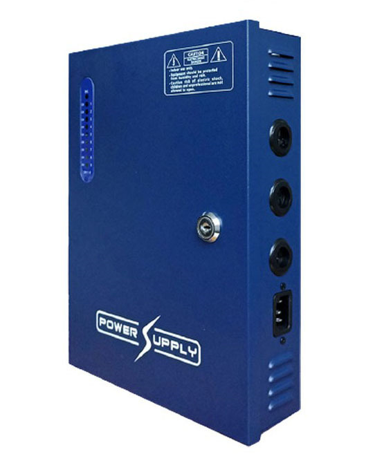 Fuente alimentación CCTV | 12V 20A 18CH/Salidas | Salida 12V, 20A. Con | función PFC | que mejora la eficiencia | Caja metálica | azul con llave. | Fusible PTC | para cada salida | Protección | sobretensiones, calor, sobre corriente y voltaje | LEDs indicadores externos. | Resistente a vibraciones | Ventilador para subidas de corriente o aumento de temperatura