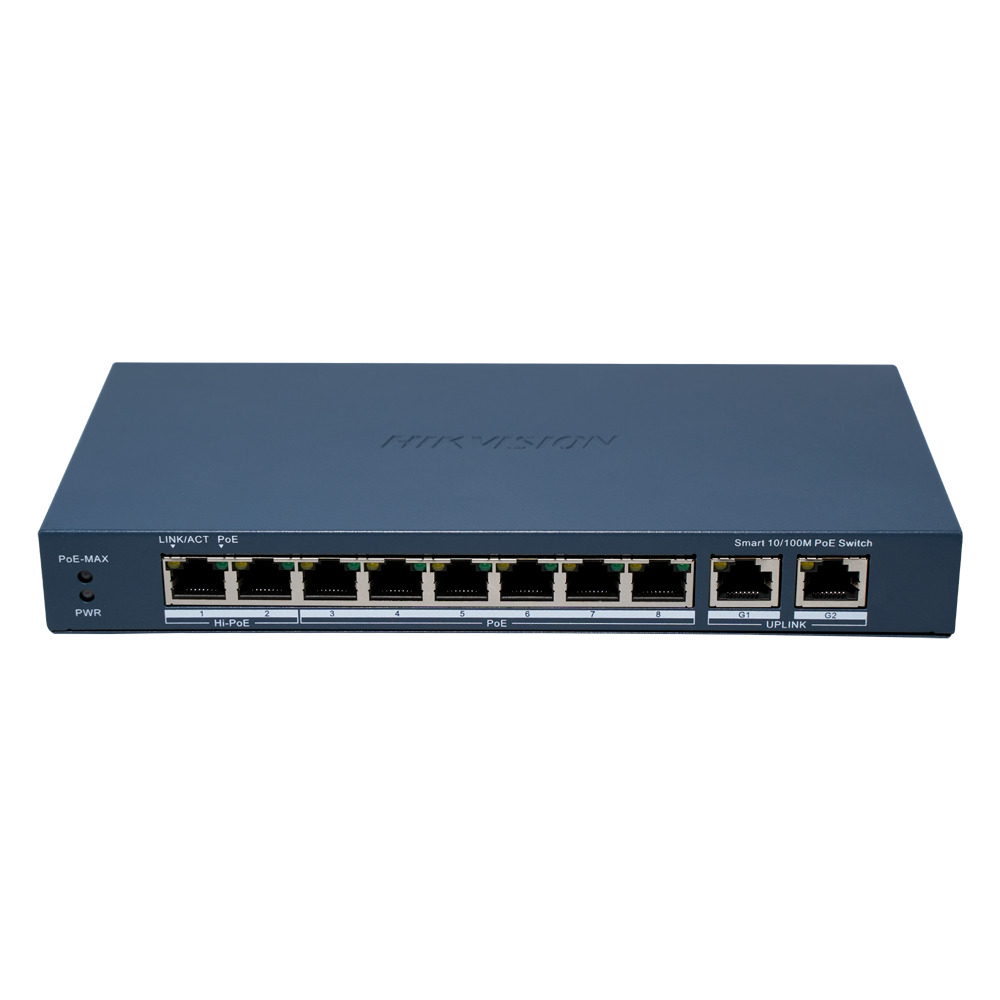El Hikvision DS3E1310HPEI(B) es un switch PoE de tipo smart-managed pensado para instalaciones de videovigilancia IP y redes profesionales pequeñas o medianas que necesitan más control que un switch no gestionado básico. Cuenta con 8 puertos PoE 10/100 Mbps para alimentar cámaras u otros equipos compatibles con los estándares IEEE 802.3af/at/bt y 2 puertos uplink Gigabit RJ45 para conectar a la red principal con mayor velocidad, lo que facilita la integración con grabadores y otros dispositivos de red.