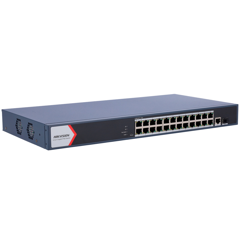 Switch PoE Hikvision - 24 puertos RJ45 GE + 1 puerto Gigabit RJ45/SFP - 24 Puertos PoE+ 802.3af/at - Hasta 370w de Potencia PoE Total - PoE Extendido / PoE Watchdog / Port Isolation - Instalación en rack/pared/sobremesa