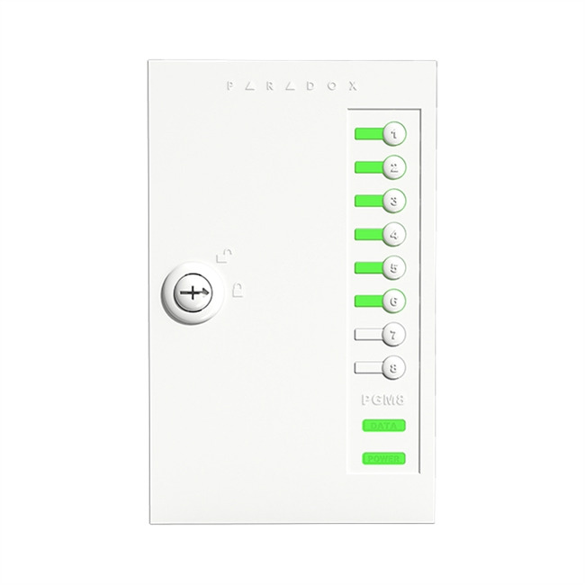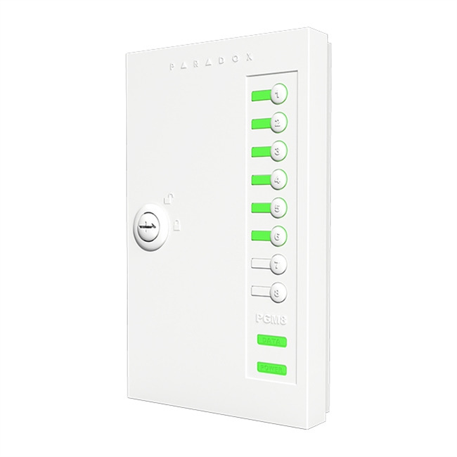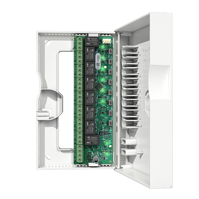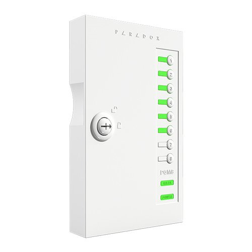 Módulo de expansión de 8 zonas salidas PGM (relés) con caja | Soporta SP, MG y EVO | Control PGM desde aplicación Insite GOLD | Control manual con switches en caja | Caja con mecanismo de cierre | Tamper en placa. FW actualizable