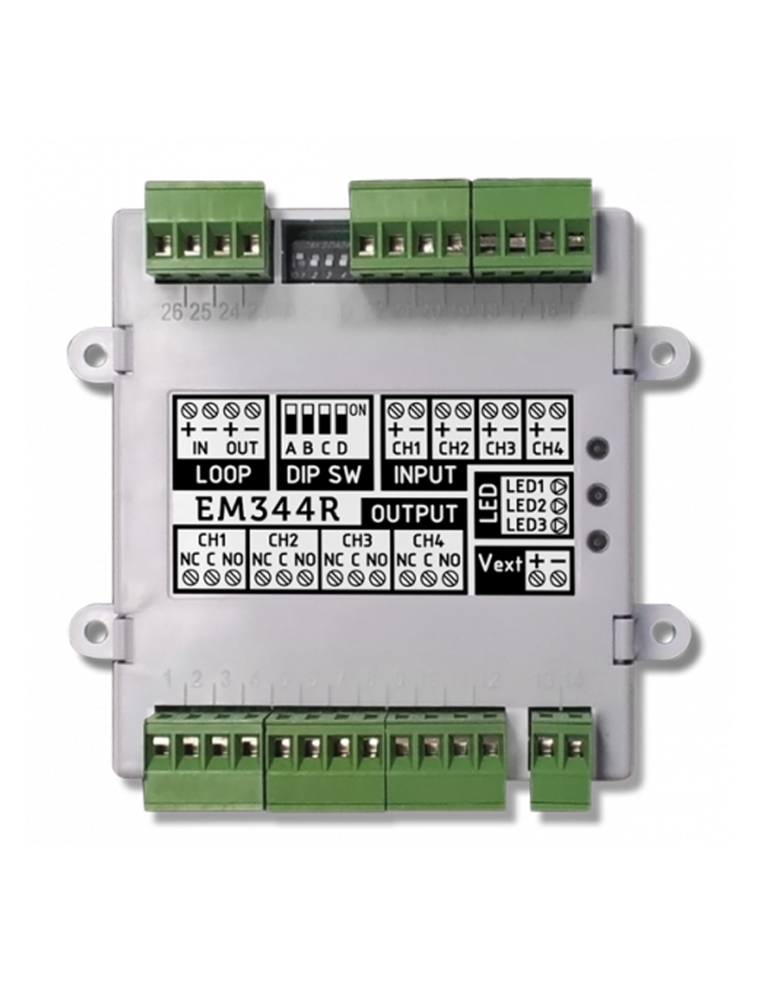 Módulo INIM EM344R 4-INPUT (2 configurável como zona convencional) e 4 saídas de relé, com isolante