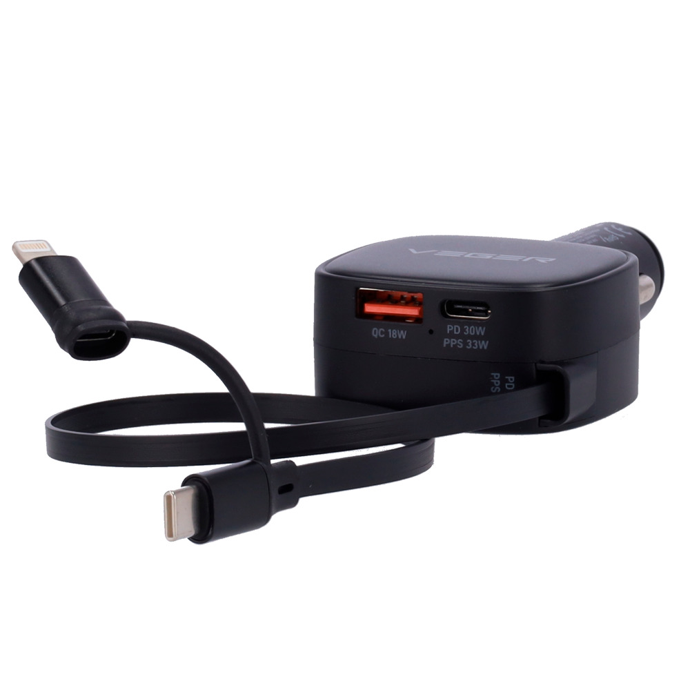 VEGER - Mechero coche - Potencia 84W - Carga rápida PD 30W, QC 18W, PPS 33W - Salidas USB-C, USB-A y cables incluidos - Cables incluidos: USB-C y Lightning